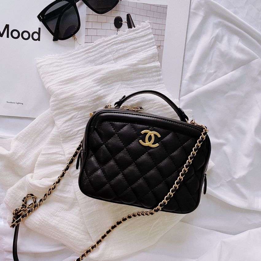 前幾年Vanity Case整個夯到一個不行,但是最知名的款式都是包包上有個超大Chanel LOGO,然後包型比較方正感,打開的方式就是中間一個拉鍊,包包一開啟就像開口笑一樣😂