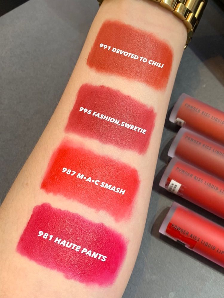 一直很喜歡MAC的絲柔粉霧系列~ 尤其是唇釉!! 雖是霧面,但完全不乾又持久不黏 上唇釋放精油包粉體的保濕成分,天鵝絨的高級質地 完全深得我心啊~🥺🥺 幫大家整理橘~粉的色系!!! 請服用~~ 圖一 💋 991 DEVOTED TO CHILI 磚紅辣椒 MAC經典到不行的橘紅色 0失手選色 💋995 FASHION,SWEETIE 是一個很可愛的蘋果紅 想入門紅唇的朋友可以試試這隻 💋987 M•A•C SMASH 帶暖調的經典正紅,韓國賣很好! 💋981 HAUTE PANTS 帶點桃色的紅,適合白皙皮膚的女生 圖二 💋¡ESCÁNFALO! 限量色 非常顯白的亮橘色,很多在台灣的韓國女生都會買這隻 💋988 A LITTLE TAMED 氣質玫瑰粉色,一點也不俗氣,還可以裝嫩😆 💋980 ELEGANCE IS LEARNDE 優雅茶玫瑰,粉度剛剛好 💋986 MAKE IT FASHUN! 大膽時髦桃紅色,叛逆反骨御用 #undefined #絲柔粉霧唇釉 #韓系唇釉 #試色 #MAC唇釉