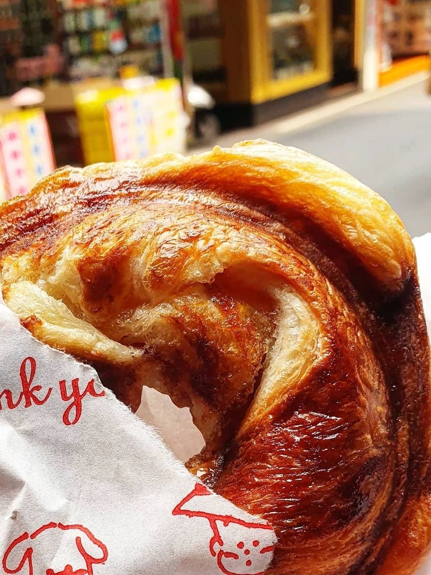 黑糖口味,馬上現烤,光聞到烘焙香氣就好幸福,更不用說撕開酥脆的黑糖外皮,裡面冒出熱騰騰的蒸氣。內裡有點像可頌,但更Q軟紮實一些,熱熱的吃,滿足感一百分,而且因為非油炸,也沒什麼油膩負擔!