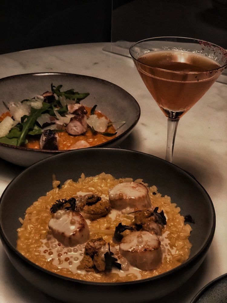 海膽燉飯放上干貝、海膽,再佐以白酒魚卵醬汁,燉飯微微帶點米心口感