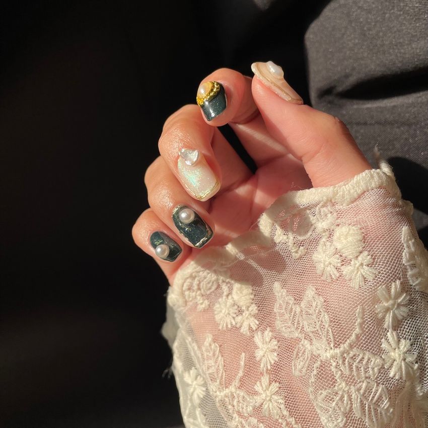 珍珠系列的美甲不知道要做幾個月🤣😚 搭配祖母綠真的是美翻了 #你今天PO了嗎 #美甲分享