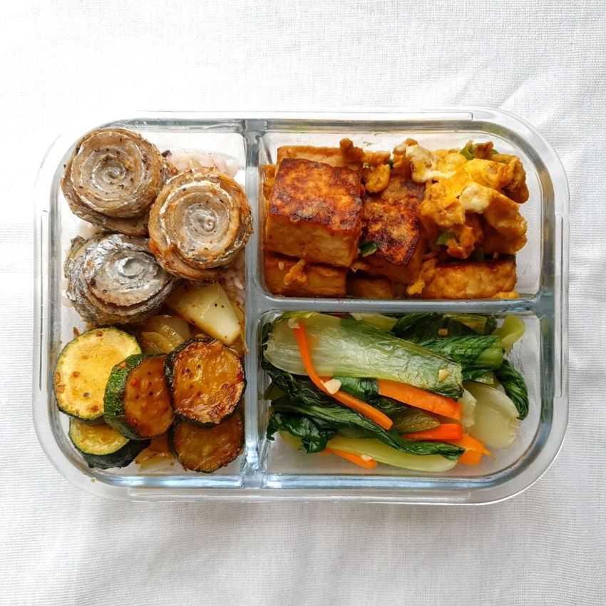 #白帶魚捲 #黑胡椒豬排 #櫛瓜 #青江菜 #豆腐 #雞蛋 #紅蘿蔔 #原型食物
