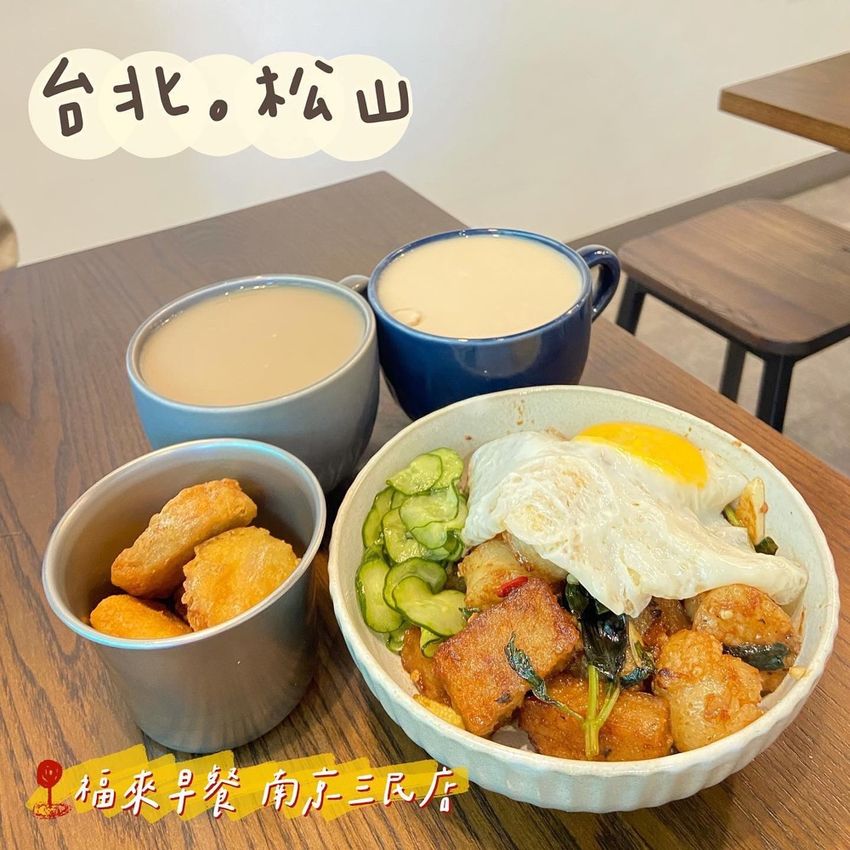 #福來早餐 👉🏻 @___foodlife___ 之前去過忠孝復興的分店,這次來的是南京三民店,這裡裝潢給人的感覺很像小咖啡廳,非常適合來個文青的微午茶時光🥰🥰 #熱炒蘿蔔糕尬米腸 $95 (加蛋+$15) 據說這是一道相當費工的餐點,先將手工蘿蔔糕、手工花生米腸下鍋油炸,再進行爆香高溫熱炒,最後再加入台灣人最愛的沙茶醬以及九層塔增加香氣! 我覺得偏重口味,很像熱炒店或是台式鹽酥雞店會有的味道😆 #台式醃黃瓜炸豬排半熟蛋 $70(加辣菜脯+$15) 炸豬排是里肌肉,配上半熟蛋、醃黃瓜讓炸物不油膩。 #煉乳起司炸饅頭 $45 福來早餐的明星商品! 花六個月的時間研製手工饅頭,再用高溫油炸至外表呈現金黃色,最後鋪上起司送入烤箱去油,使起司均勻融化於饅頭表面並淋上煉乳。 主要品嘗到麵糰炸過的香氣,饅頭裡面不會油膩,也不會太乾。 #豆漿紅茶 $45 福來早餐的紅茶、小農鮮奶茶、豆漿紅茶都是用一樣的紅茶下去調製的。 是古早味紅茶的味道,為每日現煮的決明子茶,顧眼睛又有炭焙味,無法調整甜度! 配上豆漿更增添層次。 📍 福來早餐 南京三民店 地點:台北市松山區南京東路五段163-2號 電話:0986-811-722 營業時間:平日07:00-14:00、假日07:30-15:00 福來早餐在台北共有五間分店,古亭、中和、芝山、安東店(忠孝復興)、南京三民店,在台北的朋朋若有經過可以吃吃看唷~(最後兩張是上次安東店的照片) #台北美食 #台北美食推薦 #台北美食地圖🌍 #台北美食地圖 #馬吃台北 #松山美食 #松山早午餐 #台北早餐 #台北早餐店 #南京三民美食 #南京三民站 #南京三民站美食 #福來早餐南京三民店 #福來早餐安東店#POPO帶你吃好料