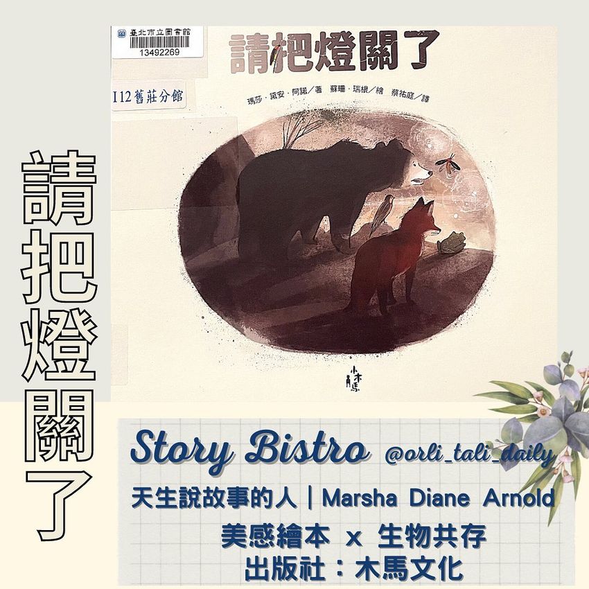 𓎤𓅮⸒⸒⸒ Story Bistro ⸒⸒⸒⸒⸒⸒⸒ ° ° ° ° ° ° ° ° 𖥧ꎺ𖦥° ° ° ° ° ° ° ° 美感繪本 ✗ 生物共存 Lights Out《請把燈關了》 ° ° ° ° ° ° ° ° 𖥧ꎺ𖦥° ° ° ° ° ° ° ° ✿•˖* 【推薦原因】 ❶ 作者瑪莎‧黛安‧阿諾(Marsha Diane Arnold)被譽為「天生說故事的人」,邀請你來聆聽與關注環境議題。 ❷ 《請把燈關了》入選國際2020年「金風箏獎」最佳圖畫書創作。 ❸生命教育繪本:環境、生命、共生。 推翻我們對於光明的想像,原來關上燈,有看見萬物的可能。 【簡要介紹】 ❶出版社:#木馬文化 @ecusbook ❷出版日期:2021/03/31 ❸主角《請把燈關了》 ♢奧莉共讀月齡參考:3Y ♢習慣並創造光明的人類或許讓許多生物失去了指引, 讓我們帶著孩子透過美好畫面, 去認識過多光源而引起的光害。 關燈,擁有滿天星斗, 點亮孩子生命教育的星火。 透過孩子純淨的心靈之眼看見了動物生靈們的不便與苦痛, 讓我們去省思—萬物和諧共生的可能。 註:作者序文中提到,人類此刻所能看到的夜空,僅僅只是四百年前的人們所能看見的百分之一。 ✿•˖* ⿻更多繪本分享: @otali_storybistro #奧莉與塔莉陪你讀繪本 🏷:#親子 #繪本 #繪本推薦 #親子共讀 #親子日常 #育兒日常 完整文章請見奧莉與塔莉IG/FB
