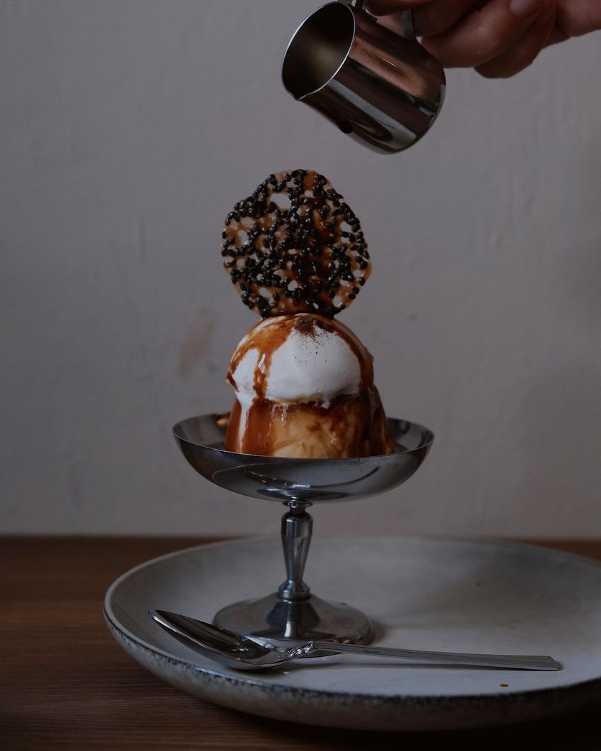 小小的店面,大約六個左右的位子,那天很幸運的可以一人點一顆布丁,他的布丁真的不是浪得虛名,脆餅阿芙朵布丁真的有夠好吃!布丁綿密滑順,淋上濃縮咖啡,搭配香草冰淇淋,苦甜交織,真的好好吃,上面的芝麻焦糖脆餅也非常的香,這布丁真的我真的可以給到滿分欸!