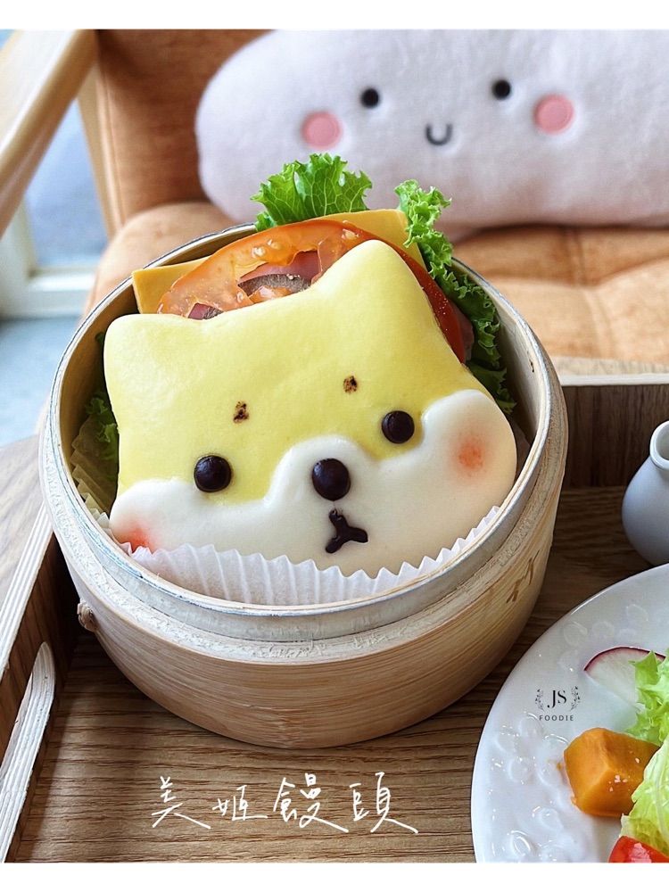 柴犬真的是很吸睛耶~甚至捨不得咬一口🥺刈包包入美姬茶香蛋、豬火腿、起司、蔬菜等,特別提一下用獨家中藥滷製的茶香蛋,很香很入味。旁邊的草原沙拉上有時用花點綴,別有巧思💐