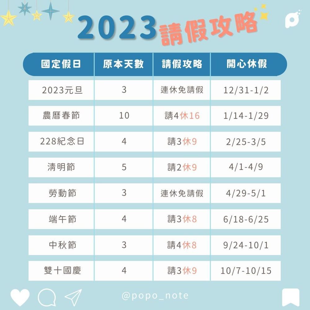 #波筆熱話題 這篇你必須收藏📌一張圖秒懂明年該怎麼請假~😉度假無罪,請假有理!喊起來~❤️喜歡收藏起來📌或分享給朋友2023這樣請最長假期竟然有16天!!快tag@朋友們準備安排起來啦~-#請假攻略 #2023請假攻略 #休假 #梗圖 #放假 #請假 #放假指南 #休假模式 #假期 #連假 #旅遊 #2023假期 #2023節日 #假期愉快 #旅遊 #旅遊安排 #2023旅遊 #放假日常 #實用 #vacation #holiday #vacationmode #POPO筆記 #你今天po了嗎