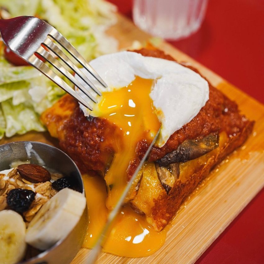 自製的番茄紅醬和羅勒淋在烤茄子披薩上,紅醬屬於偏酸一點的我很喜歡,切開剛好半熟的水波蛋,流心畫面好療癒!