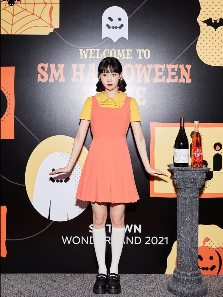 像是 aespa Winter 以圓圓大眼加修長美腿打扮成超Q木頭人娃娃!平常穿搭走甜美路線的女孩不妨參考有裙裝的造型,讓可愛與萌感集於一身!