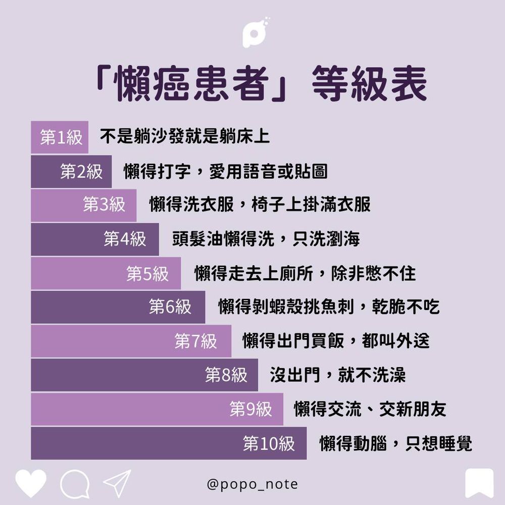 #popo熱話題 懶癌等級表📊假日絕對是懶到第十級啊!快tag你身旁懶癌發作的朋友,看看他們是懶癌第幾級~❤️喜歡收藏起來📌或分享給朋友-#懶 #懶惰 #厭世 #Lazy #情緒 #表情 #人際關係 #友誼 #朋友 #姊妹 #女生 #女孩 #日常 #生活 #日常生活 #大學 #高中 #女孩心事 #女生共鳴 #共鳴 #語錄 #迷因 #梗圖 #經典語錄 #語錄分享 #girlstyle #igdaily #girls #POPO筆記