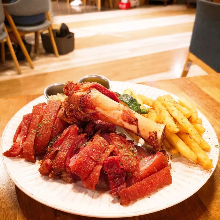 大盤子系列我們選了主廚脆皮豬腳,整隻豬腳已經將肉與骨頭分離,切成大小適中的肉片,非常體貼地免去手忙腳亂切豬腳的狼狽👍豬腳外皮烤的脆,內裡的肉嫩口,油脂豐富均勻,鹹香有味,一旁附有酸菜、黃芥末解膩❤️而且除了主食外,也可以自由選擇小點心,安妞辣洋釀炸雞甜甜辣辣,肉嫩。主廚濃湯也不錯,檸檬果萊姆茶清爽,後來免費續杯選擇了冰美式,微苦。