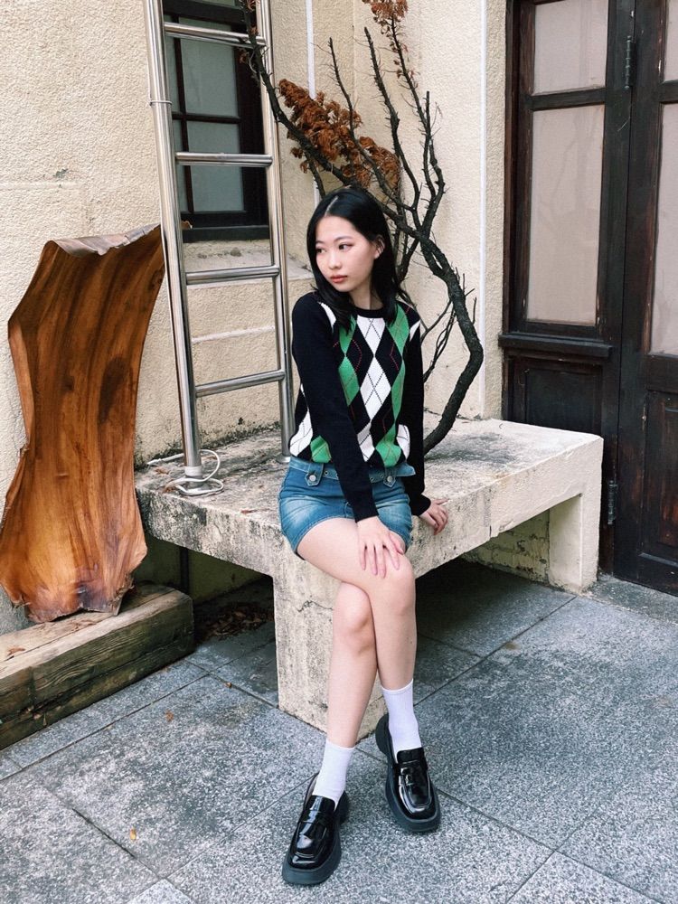 一樣來自盲盒的毛衣 真的好可愛~~~ 從沒有買過綠色學院風毛衣 搭配牛仔裙竟然有不一樣的感覺~ 現在的天氣終於可以穿毛衣了💜 #helziica #赫茲卡穿搭 #學院風 #牛仔裙 #復古