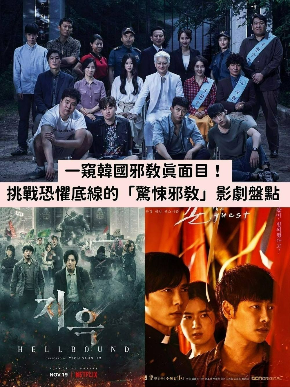近期在各大社群掀起議論、讓人看得毛骨悚然,震驚全亞洲的Netflix紀錄片《以神之名:信仰的背叛》,完整揭露了韓國四大邪教教主不為人知的陰暗面及惡行,節目中播出的種種真實畫面、錄音,以及受害者現身訪談的內容,瞬間引發大家的怒火跟憤怒!韓國影視也經常將「邪教」題材寫入作品中作為警示,利用宗教控制人心的內容,雖然較為沉重,但依然深受劇迷歡迎。今天就帶大家一起來看看令不少人嚇到咋舌的韓國邪教影視作品有哪些吧~
