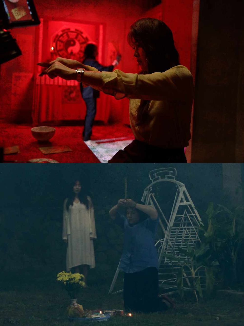 🔴越南恐怖電影《厲嬰魂》看點#2: 【挑戰墮胎議題道德極限】 電影《厲嬰魂》不僅在「人性」刻劃上挑戰道德極限,也在製作上致力打造讓人毛骨悚然的觀賞體驗。為了完美呈現片中寬敞漂亮又兼具陰暗空間的房屋,劇組耗費數月時間謹慎尋覓,並在找到過後,再用數週時間重新設計房內空間,讓演員們在進入屋內後,紛紛起雞皮疙瘩,就連飾演男主角「東」的國輝(Quoc Huy)也直呼:「陰到骨子裡!」,再透過後製效果,勢必讓觀眾在觀賞本片時,會被全方位的驚悚感嚇到叫媽媽,孕育觀眾全新夢魘!導演也沒有疏忽色調與音樂細節,選以黑色與藍色作為本片主要色調,有效描繪出恐懼與冰冷的空間感,並在重要時刻採用紅色突顯視覺,創造強烈又刺激的印象;同時還將越南兒歌〈晚安曲〉旋律重新混音置入。透過視覺與聽覺的雙重驚悚效果,讓觀眾隔著銀幕也能感受被毛骨悚然氛圍包圍的恐怖體驗!