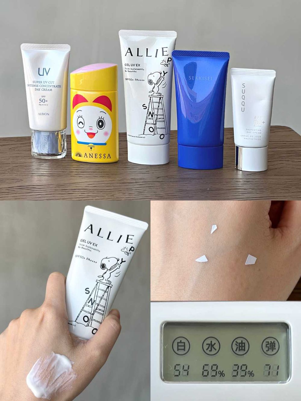✨結果:從測試結果圖片可以看到,含水度最高的就是KOSE的防曬,從質地就能感受到它的水感潤澤,非常適合乾性肌膚使用!其次則是ALBION、SUQQU這2款同樣強調擁有高保濕度、卻又十分清爽潤澤的妝前防曬乳,使用後能讓妝容更服貼!而ALLIE因為是水凝乳狀質地,也擁有不錯的水潤度,吸收度很好、喜歡柔潤水感的人可以嘗試看看。最後,超級推薦喜歡清爽柔焦感膚況的人,就使用安耐曬的防曬露,很快吸收變成一層柔霧膜,摸起來十分清爽舒適!