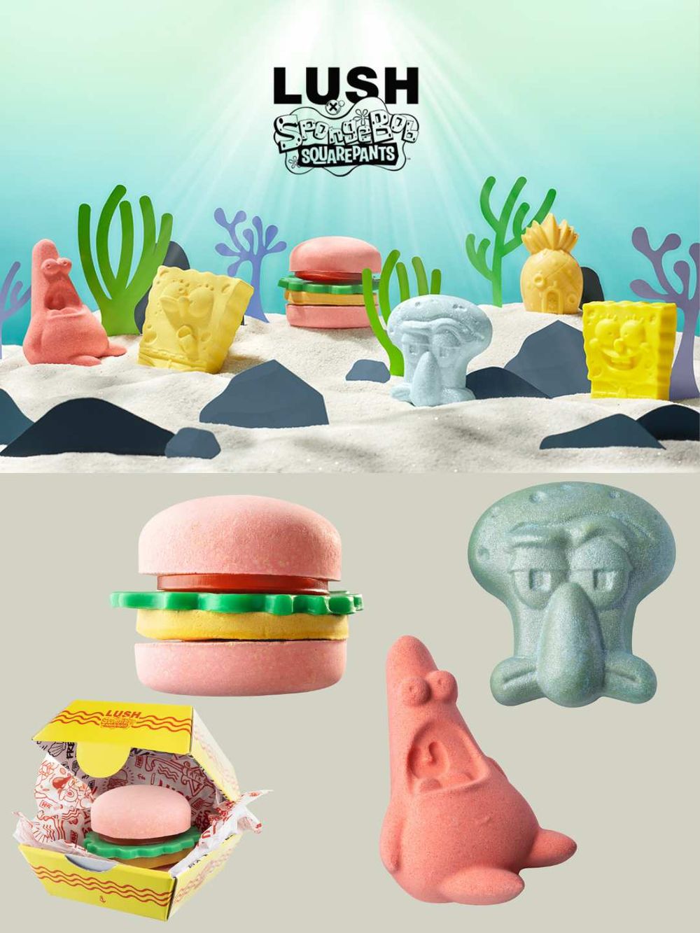 「我們喜歡肥皂!作為代表一個標誌性的角色、系列和品牌《海綿寶寶》創建了一個無塑產品系列,代表我們正在努力保護的海底世界。我們很高興能夠與尼克兒童頻道及派拉蒙影片合作,推出《海綿寶寶:改變海洋行動》。其中,美味蟹堡沐浴組合是我們的得意之作——混合香氛皂、汽泡彈和泡泡浴芭,散發充滿熱帶氣息的鳳梨和椰子的香氣。」—Melody Morton,LUSH Concepts 概念創意總監