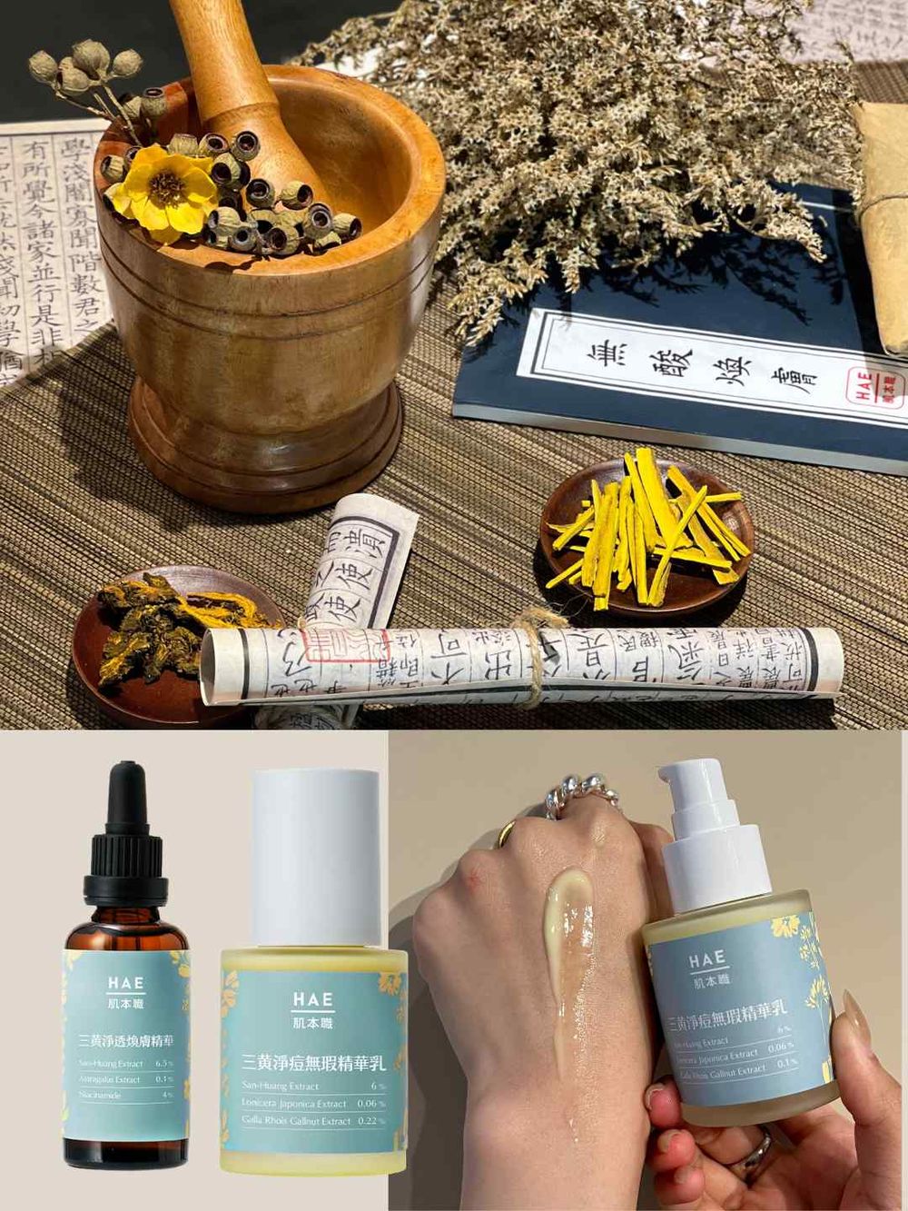 秉持著中醫師「治本」理念養護調理膚質,由中醫師共研的台灣中醫醫美品牌『HAE 肌本職』運用現代醇水萃取科技及中醫治療油痘粉刺的外用三黃膏,推出「三黃無酸煥膚系列」,加入全新升級「三黃科研精粹」複方,可對油痘粉刺調理發揮加倍功效,有別於傳統三黃膏帶苦味的厚重質地、吸收慢、暗黃色澤易沾染等問題。此系列均大幅將三黃膏改良得更好吸收,且為珠光親膚色質地。皆不含AHA/BHA酸類成分、香精、酒精、色素及防腐劑,透過無酸煥膚的原理,全面調理內胞頑固粉刺、毛孔粗大、暗沉。