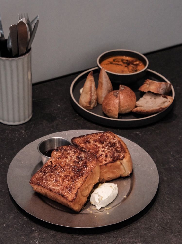 ⠀⠀⠀⠀⠀⠀⠀⠀⠀⠀⠀⠀⠀⠀⠀⠀⠀⠀ 📍 Moon Baking studio #新店報報 ▫濃湯野餐盤 $250 ▫焦糖法式吐司 $260 ▫楓糖可頌 $75 ▫紅豆圓法 $60 - 又是一家想吃很久的店! 臨時興起預約到早上10:00的位子 很久沒為了吃早餐早起🤣 11:00陸續擺上各種麵包 琳瑯滿目的麵包櫃太美 麵包控肯定會瘋掉~ 這次每日濃湯是番茄的 微微辣番茄味濃郁 麵包除了圓的那顆其他都滿硬的 牙口好才咬得動😂 閃閃發光的法式吐司榮登這次最喜歡的! 外脆內鬆軟 不會很甜 好吃~~ 可惜可頌不是我們喜歡的酥脆類型🥺 可愛的紅豆圓法也還不錯🤍 - #今日想去哪_台北 #今日想來點_早午餐 #新開幕 #台北美食 #台北美食 #台北早午餐 #松山區美食 #松山區餐廳 #松山區早午餐 #中山國中站美食 #早午餐 #moonbaking #濃湯野餐盤 #法式吐司 #紅豆圓法 #可頌 #相機先食