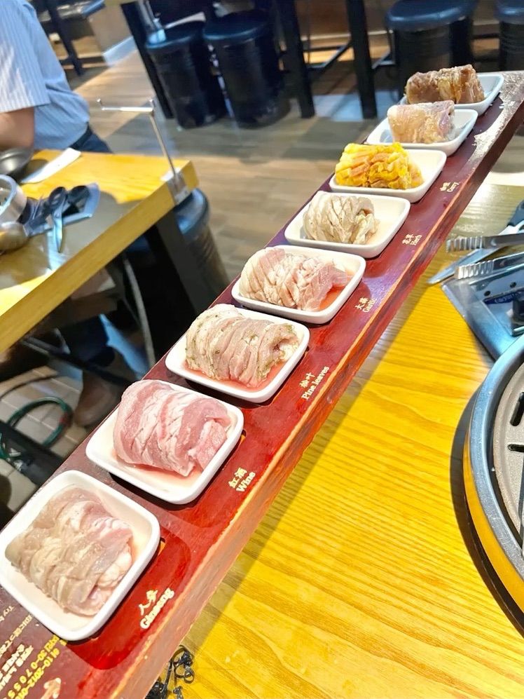 那他的招牌八色烤肉-人蔘、紅酒、松葉、大蒜、花草、咖哩、大醬、辣椒醬-是必點的,從味道輕的到重烤來吃,結果幾乎都是咩咪在動手,我們都在動口😂,其實味道吃起來都很順口,重點是肉質,很厚很大片,咩咪專業烤👍👍👍,蔬菜包肉一定最後要吃來解膩的😋