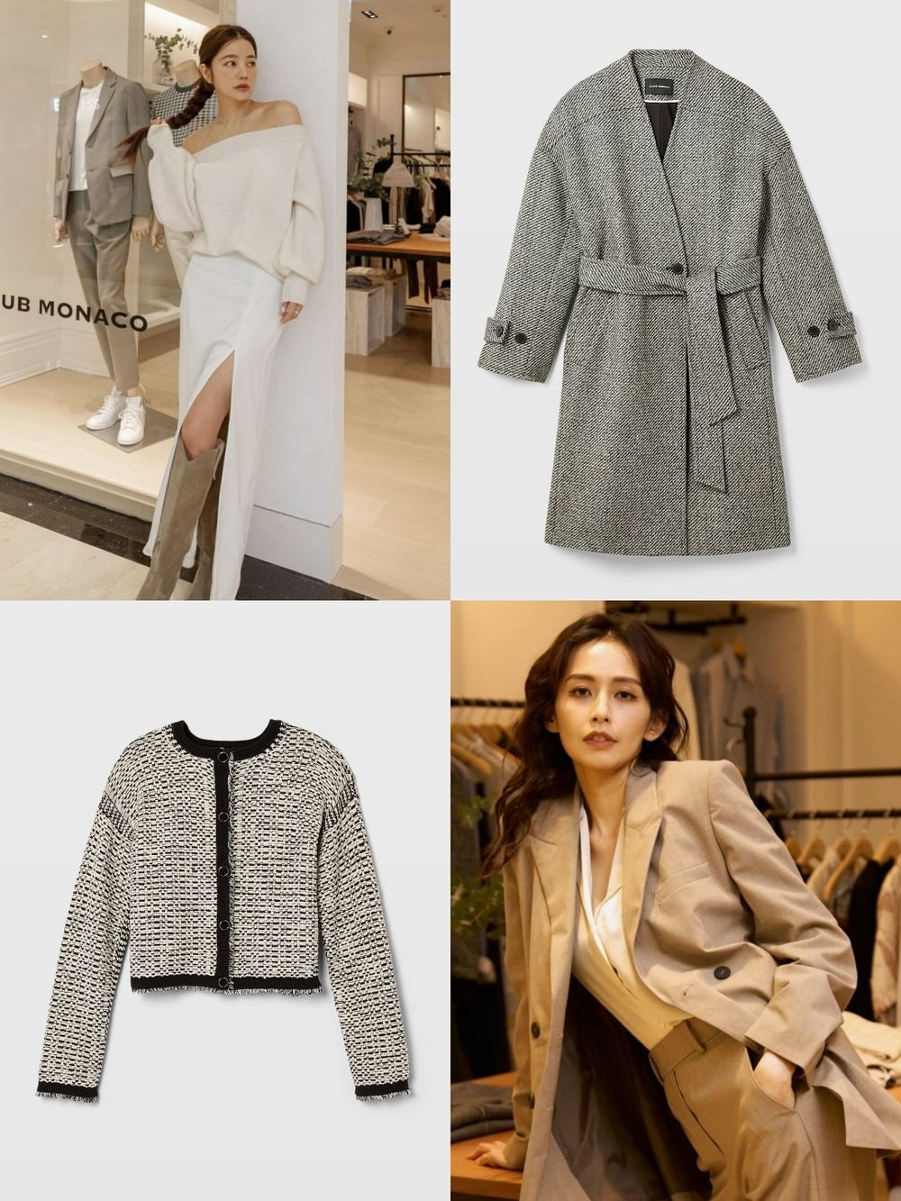 2023秋冬系列男女裝以簡約線條、精緻輪廓和奢華舒適的面料織成,修身的針織洋裝、優雅的粗花軟呢套裝、雅緻的絲綢襯衫等高質感時髦單品,為都會職場女性提供高品味的選擇。品牌名稱的字頭「C和M」,以方塊數碼印花重複排列呈現出專屬於品牌的獨特老花圖騰。全新Club Monaco Monogram圖騰也於2023秋冬系列正式亮相。