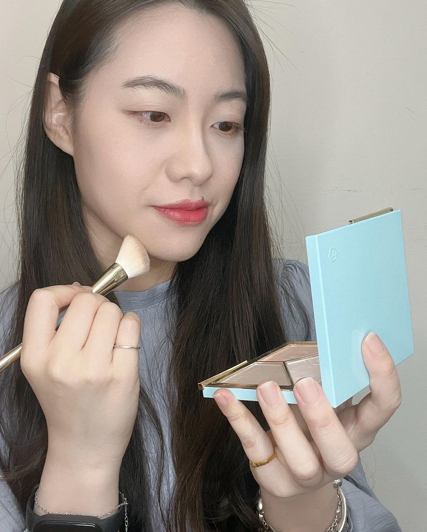 由於本身的臉型偏長,因此我只會輕掃一點胧影棕在下顎線、雙下巴與髮際線的位置,