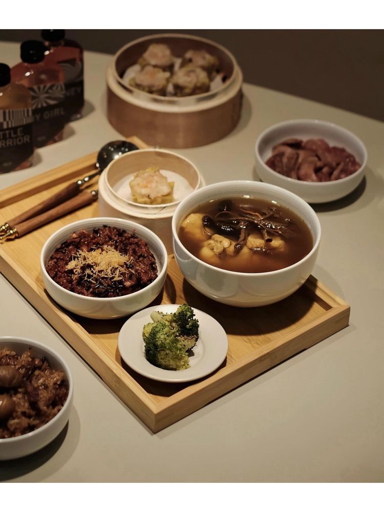 套餐含有黃耆樹菇雞湯、魚子燒賣、時蔬、油飯,油飯部分有干貝紅麴、黑松露、堅果臘肉可供選擇;其中我最喜歡的是干貝紅麴油飯