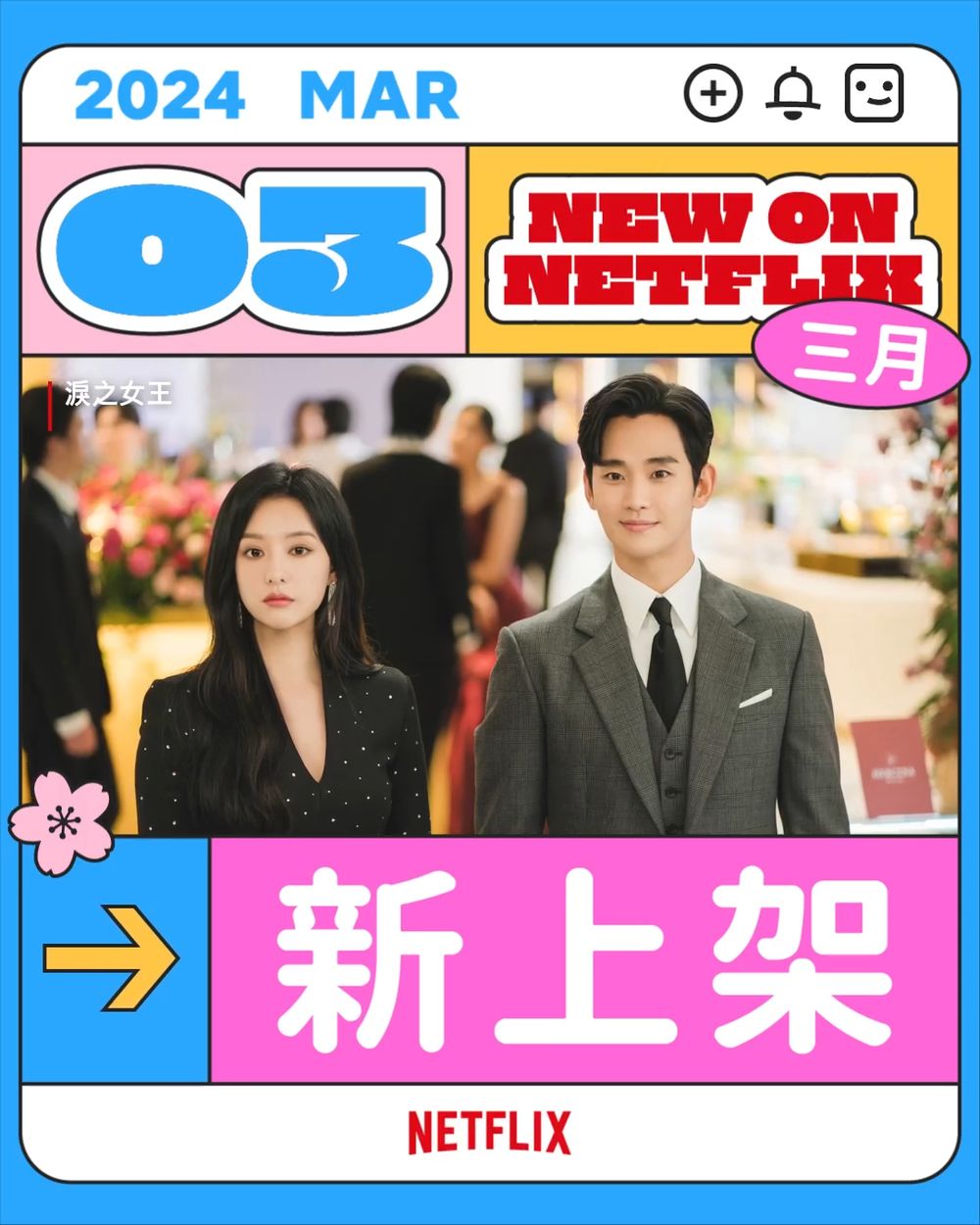 3月1日:《中學聖日記》、《非自願的不死冒險者》、《環球饗宴:菲爾來吃飯:第7季》 3月3日:《脫軌》 3月6日:《老闆不是人》 3月7日:《紳士追殺令》 3月9日:《淚之女王》 3月10日:《南風知我意》 3月14日:《異人之下》 3月15日:《炸雞奇遇記》 3月19日:《體能之巔:百人大挑戰:第2季》 3月21日:《戀愛島:澳洲篇》、《3體》 3月22日:《比佛利山豪宅經紀:第2季》 3月27日:《鹽湖城貴婦的真實生活》、《絕妙騙局》 3月29日:《這是蛋糕?!:第3季》source/ IG@netflixtw、Netflix提供
