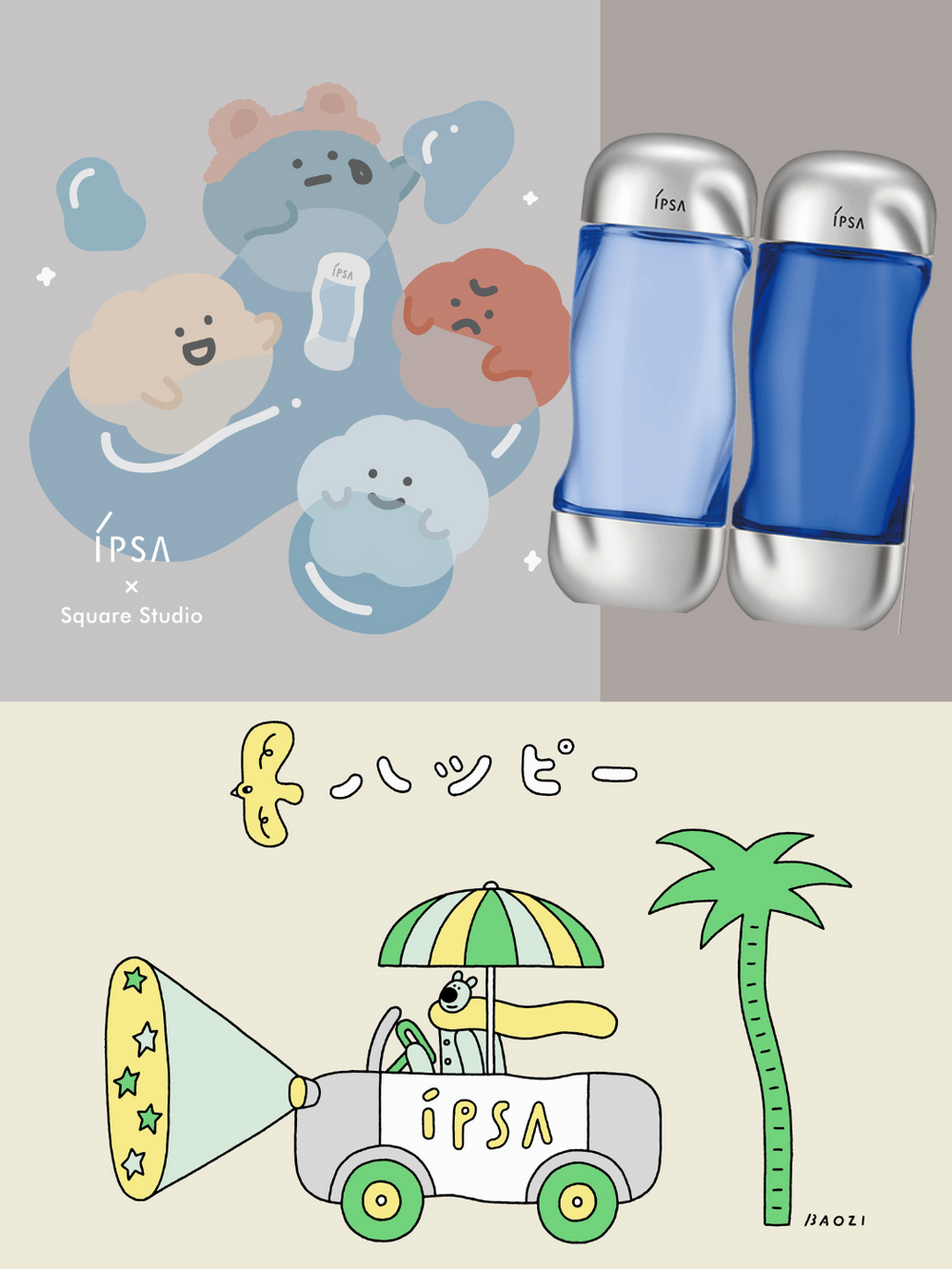 熊超人限定聯名只在母檔!IPSA與文青插畫家包大山攜手合作,將流金水結合簡單可愛的插畫,打造時髦生活小物。插畫的車子瓶身以流金水外型發想,日文「ハッピー 」= 愉快的意思,讓流金水陪你一起開心去旅行,帶著一顆光彩煥發的心,照亮眼前所有風景,也讓流金水照亮你的肌膚,養出透亮嫩肌!