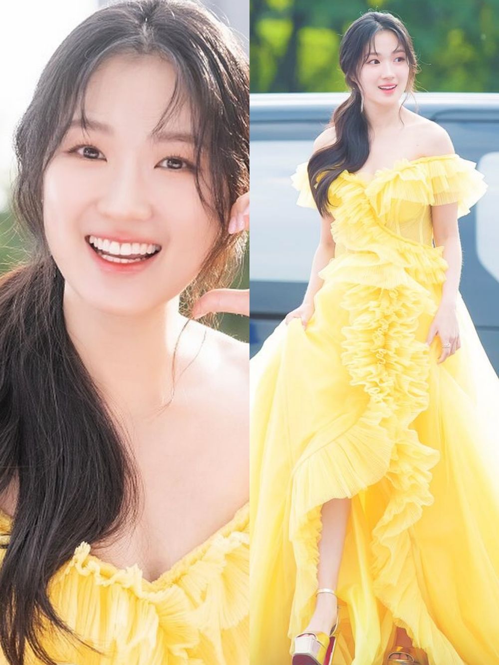 今天的金惠奫綁著一頭慵懶微捲的側馬尾,配上一襲亮黃色禮服步上紅毯。禮服採用了薄紗材質、平口設計與多摺的荷葉邊剪裁,讓整身造型充滿浪漫的飄逸感,同時也充分地展現了公主漂亮的一字肩。不少韓媒看到金惠奫今天這套造型都大讚她像是《美女與野獸》的「貝兒」,因此小率也獲得了「人間貝兒」的新封號。
