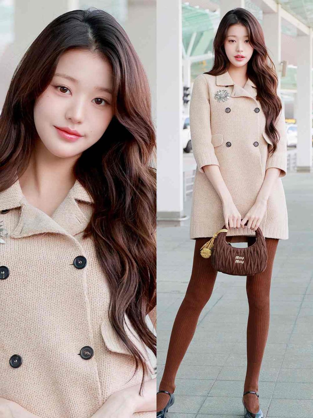 其實在早在降臨機場前,員瑛就搶先在個人Instagram曬出一系列美照。她身穿了一襲來自Miu Miu FW24大秀的設計,刺繡羊毛外套化身短裙造型,並且內搭了咖啡色針織長襪,打造出經典的Miu式千金穿搭。而為了讓駝色的造型更有亮點,員瑛選擇在胸前搭配上了水晶裝飾金屬胸針,簡單的利用小細節為造型增加高貴感。