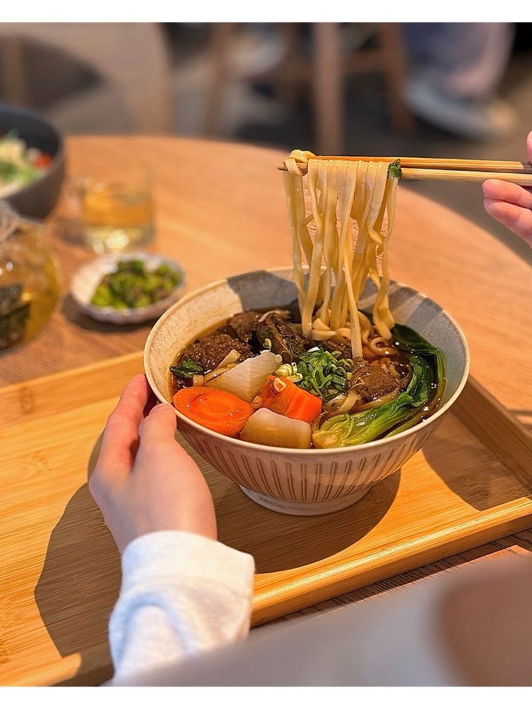 📍勺日Zhuori 還記得幾年前初訪勺日,來的是復興南路上的日好空間本店,奶茶色的裝潢與柔和燈光,那股由內而外的溫馨與愜意,仍深刻猶存在心,是我在台北相當喜歡的咖啡空間。 -𝐦𝐞𝐧𝐮- • 培根滑蛋佐酪梨泥早午餐 325 眷村紅燒牛肉麵 395 • 口水雞沙拉 240 • 清新鮮橙包種茶 160 • 焙茶拿鐵 170 / 這次和朋友相約再訪,剛好也是選在日好空間!恰逢勺日推出新菜單,保留經典輕食品項,同時融入亞洲元素,在日漸轉涼的天以一碗溫熱的牛肉麵溫暖食客的心☺️ 早午餐系列是菜單上的經典之一,現在除了可頌堡和大早餐盤,還多了開放式三明治等選擇,深得我心!如果沒記錯的話,勺日是選用Pure Bread的酸種麵包,烤得外酥內柔韌麵包,鋪上酪梨泥、培根片、松露炒蛋,豐富的滋味層層堆疊,再點綴上風乾蕃茄與綜合炒菇,吃起來健康無負擔,滿足感與飽足度兼具。 另一道新品「口水雞沙拉」是我的心頭好,舒肥過的雞肉柔軟不柴。以胡麻醬和青花椒油帶出中式口水雞的味型,吃起來清爽卻不無聊。很適合點一份和朋友一起分享。 在咖啡廳裡吃牛肉麵,是什麼樣的感覺? 「以優雅姿態品嚐小吃」就是最佳註解。 眷村風格紅燒湯,以豆瓣香氣取代中式藥膳味,喝起來溫潤適口。寬扁麵條帶有咬勁,牛肉塊也燉至入味柔軟,搭配上舒適愜意的氛圍,各種感官都被照顧到。 本以爲鮮橙包種茶是會像氣泡飲般呈現,沒想到是以熱茶姿態上桌。將熱沖包種茶結合新鮮橙片,為清雅包種茶注入柑橘果韻,自然的清甜感相當迷人。 焙茶拿鐵甜度本身是可以調整的的,特別請店員幫我們做微微糖,喝起來甜度剛好。輕啜一口濃香溫熱的焙茶,再搭配附上的黑糖蕨餅小點,香甜又暖心。 除了日好空間門市,忠泰樂生活店也有供應新菜單呦!微涼的秋日,來勺日感受全新菜單&美好空間帶來的溫馨氛圍吧! -𝐢𝐧𝐟𝐨- 【勺日Zhuori 日好空間店】 ▷ 電話|02 2711 0222 ▷ 交通|捷運 忠孝復興站 ▷ 地址|台北市大安區復興南路一段206號 ▷ 營業|每日 09:00-20:30 - 𝖴̈ 𝖶𝖠𝖭𝖳 𝖬𝖮𝖱𝖤 #雲的台北食旅 #雲吃早午餐 #雲吃台北東區 - #勺日 #新菜單 #台北美食 #東區美食 #大安區美食 #忠孝復興美食 #台北餐廳 #台北咖啡廳 #台北早午餐 #taipeifood #taipeifoodie #美食攝影 #台北美食推薦 #11月POPO創作者分享 ・:*+.・:*+.𓌉◯𓇋