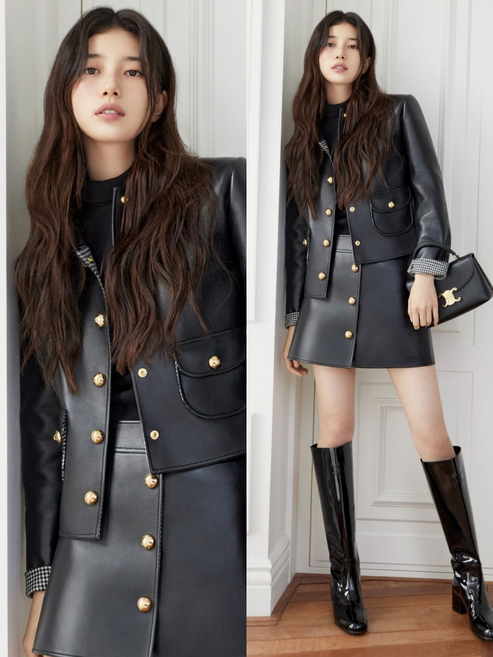 如今終於確定花落CELINE家~在官宣成為全球品牌大使的形象照中,秀智以全身黑色系為穿搭主軸,運用皮革套裝的材質讓整體更有亮點,手拎著的CELINE TEEN NINO黑色包包更是最近女孩間討論超高的爆款,腳上的漆皮感黑色長靴修飾出修長筆直的雙腿,這套穿搭完全就是女生們的冬季穿搭範本,看了好想把整套帶回家呢!