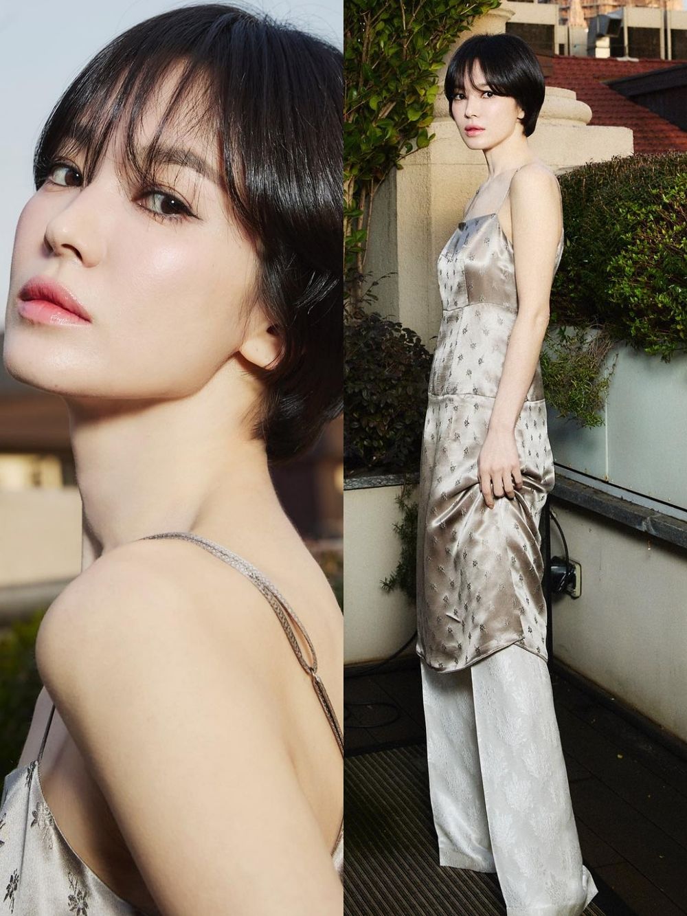 而宋慧喬也在IG上分享一系列脫下外套的照片,原來外套內搭的是一件緞面細肩帶長版上衣,香檳色系的光澤感映襯著宋慧喬白皙的肌膚,整著人在陽光下閃閃發光根本就是仙女下凡,也能看出她十年如一日的纖細好身材,已經43歲的她真的是標準的「與時光逆行」,也引來網友們大力稱讚新髮型真的太減齡了!