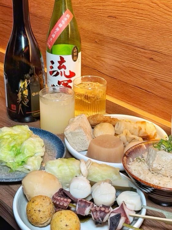 主打關西風關東煮 品項多達30種 還有日本酒可選 入桌後會上一杯高湯暖胃 湯可以無限續
