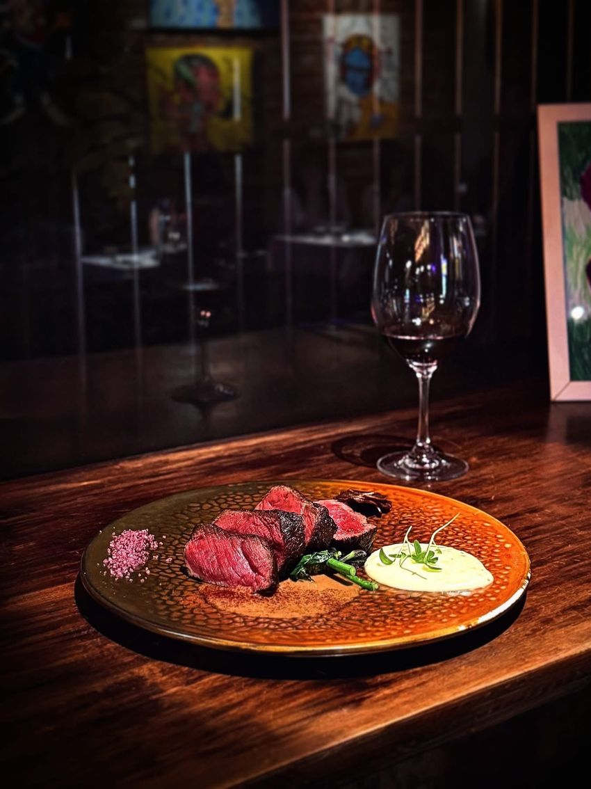 主餐鹿肉熟度拿捏地恰好、完全沒有野味的肉腥感,肉質柔軟多汁彷如五分熟的牛菲力,搭配上柔順青蔥薯泥、可可堅果奶油醬,與紅酒渣炒成的紅酒鹽,帶甜感的醃漬薑片畫龍點睛,不誇張,這大概是我人生截至目前吃到最滿意的鹿肉料理。