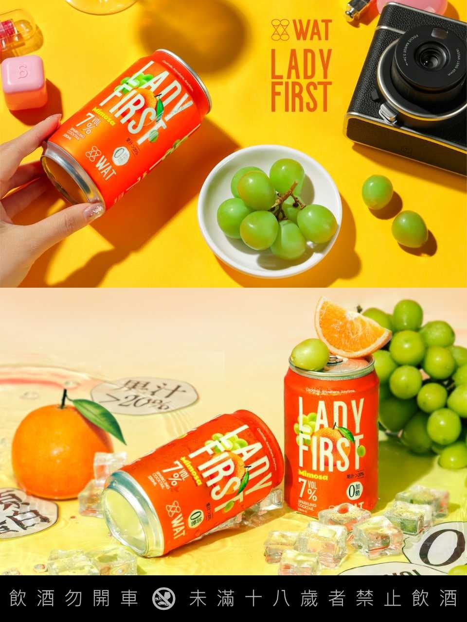 屬於妳的微醺時刻!台灣最潮瓶裝雞尾酒品牌WAT推出全新產品「Lady First」氣泡雞尾酒,是針對市場需求,唯一專為姐妹們調製的雞尾酒。不同於市場7%酒精濃度,為追求微醺體驗的消費者提供更勝微醺的選擇。靈感源自經典Mimosa調酒,「Lady First」融合超過20%的天然柳橙汁與白葡萄香氣,零加糖真果汁加膠原蛋白的組合,展現自然果香與輕盈氣泡的完美平衡。