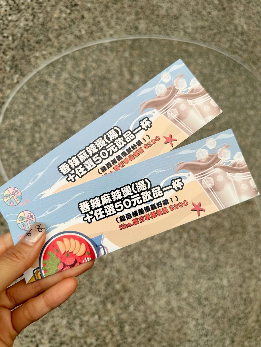與肉麻麻辣燙有組合優惠,兩邊都打折,還有老賴茶棧的 50 元飲料抵用券.ᐟ