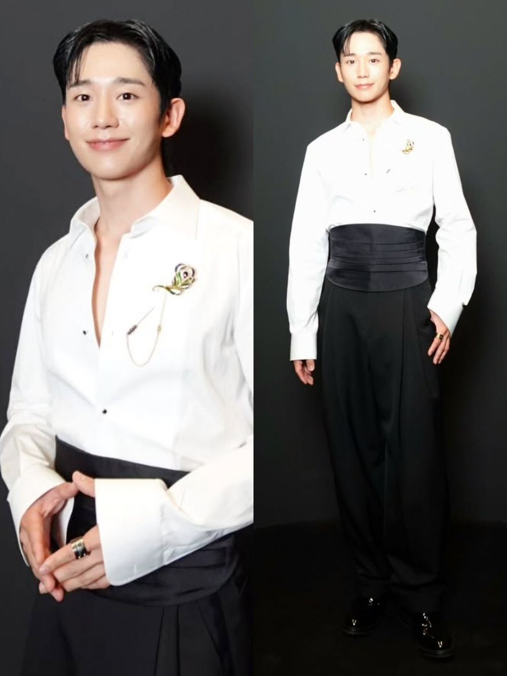 有別於上次時裝周的深酒紅色系的正裝造型,這次丁海寅選擇了黑白搭配,以經典燕尾服為靈感,換上了白色襯衫搭配黑色西裝褲,並以扣子刻意沒扣好的隨興的穿法,露出結實的胸膛線條,高級的極致魅惑感真的有夠逼人!而到了秀場外,丁海寅還特別奔跑到粉絲那側揮手打招呼,展現男神親民魅力!