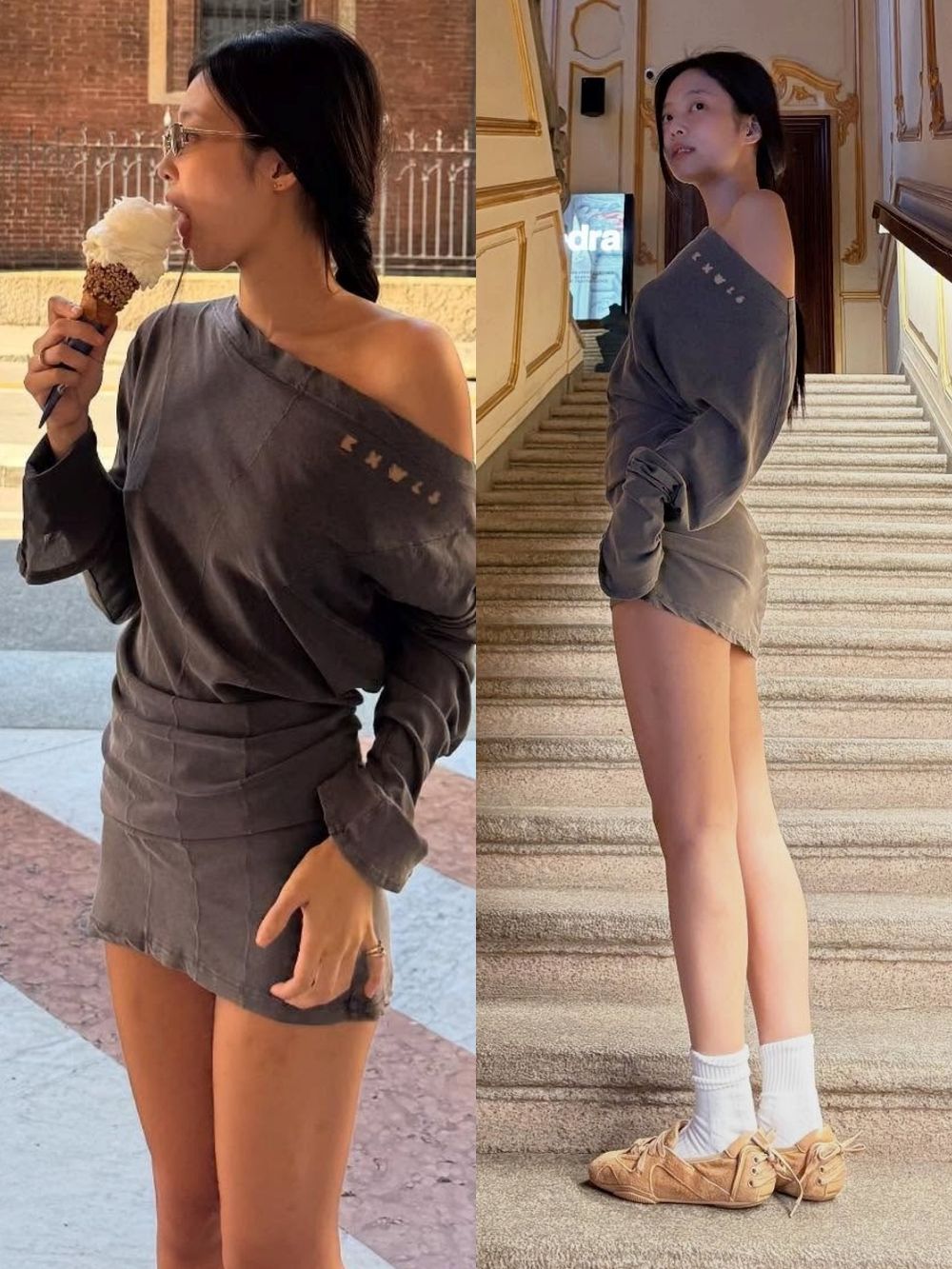 Jennie身上穿的合身斜肩小洋裝原來是來自倫敦設計師品牌KNWLS,走可愛又大膽的微辣風格,也是許多明星們鍾愛的私服品牌之一,運用剪裁與舒適材質混搭,打造出隨興又充滿時髦氛圍的單品,難怪深受Jennie喜愛,洋裝上的剪裁及腰間抓皺,悄悄再拉高腰線營造長腿比例,也讓珍妮的好身材一覽無遺!